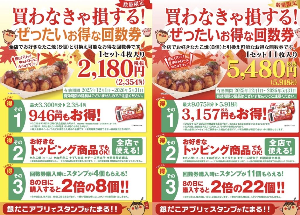 そのまま利用しても良いですが、お得な回数券を優待券を使って購入するほうがお得になります。いつ販売されるかは銀だこアプリのお知らせをチェックしてみてください。